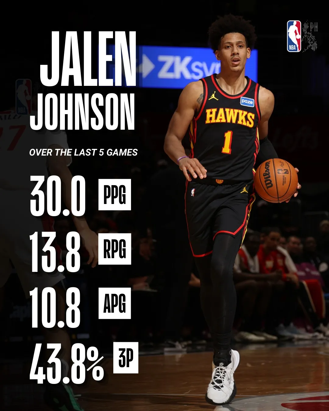 如果你只看数据,会觉得这简直是一场电子游戏:过去五场比赛,杰伦·约翰逊场均轰下30.0分、13.8个篮板和10.8次助攻,投篮命中率50%,三分命中率高达43.8%。