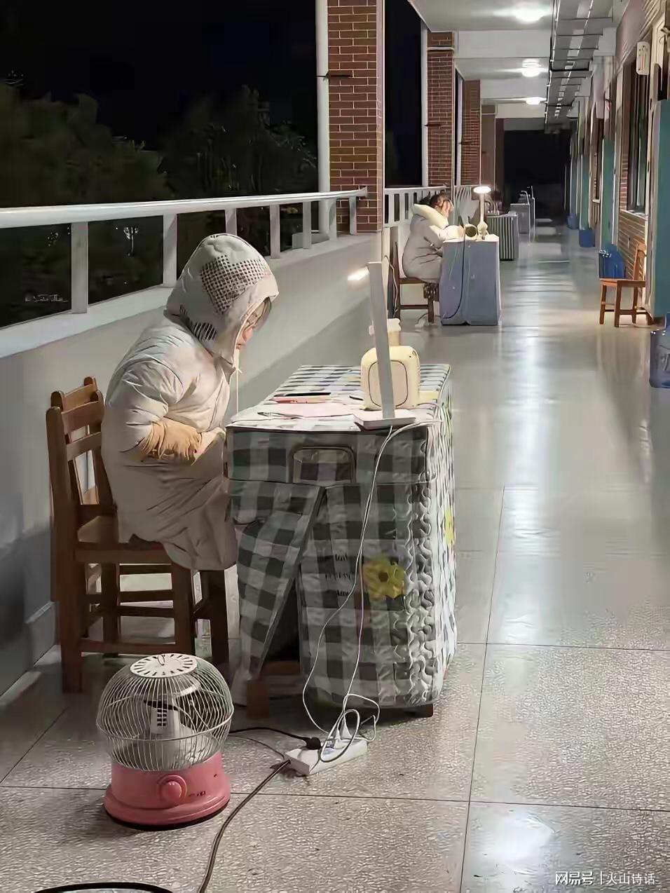 根据图片显示,一张桌子一个板凳,桌上的台灯暗示晚自习老师还要坐在走廊里办公,地上放“小太阳”取暖器也挡不住挨冻。