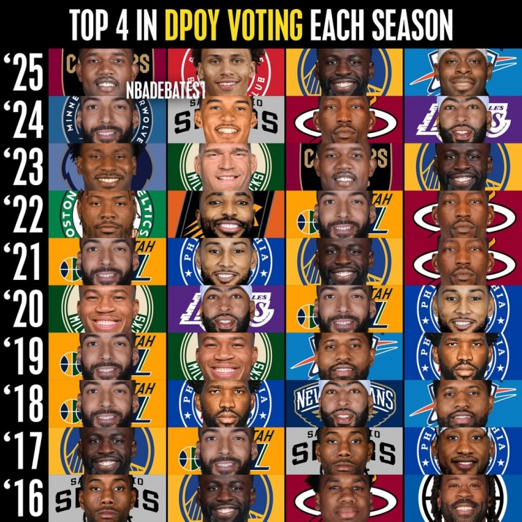 ⛓️近10年DPOY前4:戈贝尔追梦浓眉热巴多次入围 本西21年险夺魁