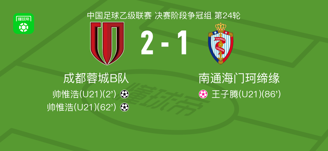 九游体育官网-成都蓉城B队2-1海门珂缔缘,帅惟浩独中两元