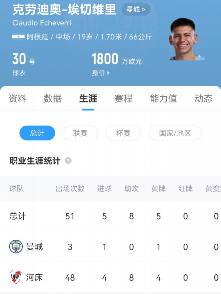 现年19岁的埃切维里自冬窗正式加盟曼城以来,仅代表球队出场3次,攻入1球,目前转会市场估价为1800万欧元。