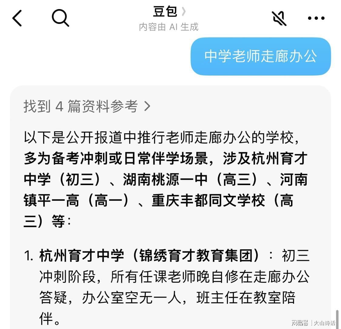 另外,根据网络查询,以下是公开报道中推行老师走廊办公的学校,多为备考冲刺或日常伴学场景,涉及杭州育才中学(初三)、湖南桃源一中(高三)、河南镇平一高(高一)、重庆丰都同文学校(高三)等。