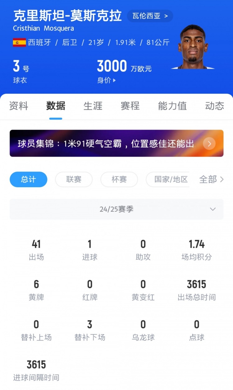 莫斯克拉的出勤率也很不错,从过去两个赛季就可以看出来。自2023年8月进入瓦伦西亚一线队以来,他在72场联赛中首发了70场,在西甲的累计出场时间达到了6394分钟,这一数据在欧洲五大联赛21岁及以下球员中是最高的。